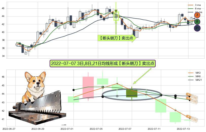 ⚀ 2022-07-07日显现 3日-8日-21日均线 【断头铡刀】卖出点 看空信号,后市看跌,卖出