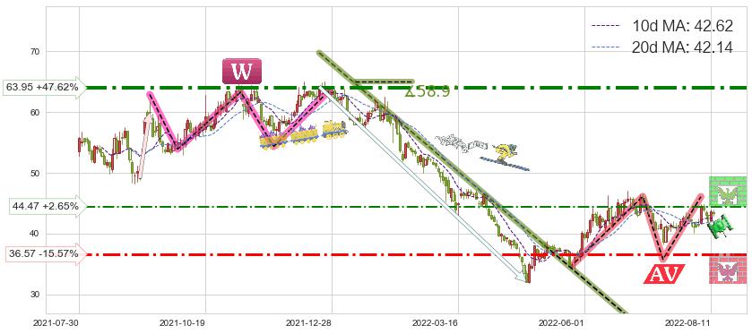 ♘ 阻力价格位44.47,可信任强度52.35%,距离最后交易2022-08-12形成的收盘价格43.32相差 +2.65%
