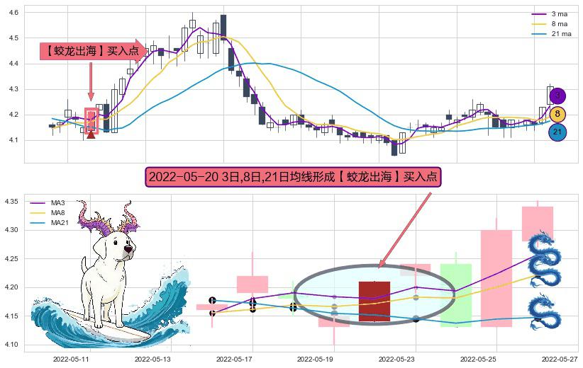 ⚀ 2022-05-20日显现 3日-8日-21日均线 【蛟龙出海】买入点 看多信号,后市看涨,买入