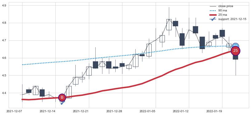 ⚁ MA3和MA8走势平行,且始终保持在短距离内,MA21始终在短中期均线上方,与短中期均线保持一定的距离,微微下行