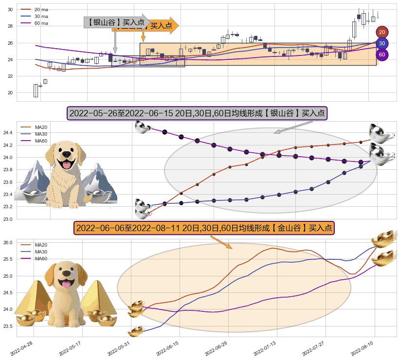 ⚄ 2022-06-07-日至2022-08-11-日显现 20日-30日-60日均线 【金山谷】买入点 其再次确认了买入信号,可靠性更强,买入