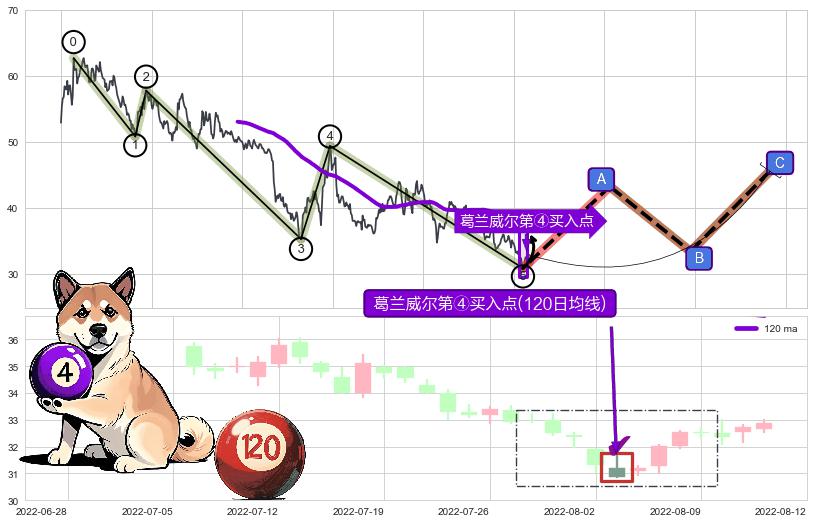 ➢ 收盘价(2022-08-11: 32.72 )→再次回踩→第一根k线低点(2022-08-01: 32.00 )