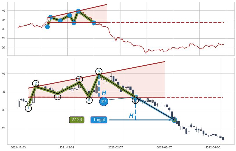 ➢ 【卖1】: 激进型 卖点→(2022-02-14: 33.50 )形成突破【扩散】三角形反转【反转】形态