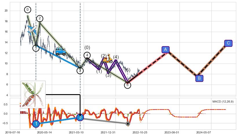➣ 第一, 三, 五浪下跌动能逐渐【衰弱变小】,趋势呈现不稳迹象