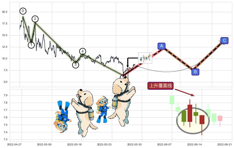 | 4 🅚:上涨两颗星 | 上涨三颗星 ➕ 🌊:波浪理论猜想下跌浪5已形成,猜想后续形成abc反弹上涨(均值回复) ☞ 看多信号 ⇥ 【🅚线】交织【图形】⇥ 综合量化分数: 58 | > |
