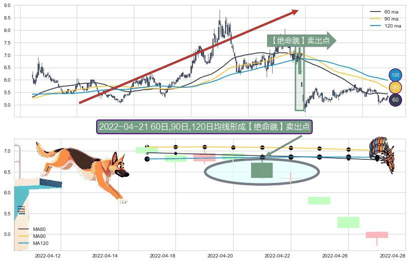 形态多维评估: ⚀ 2022-04-21日显现 60日-90日-120日均线 【绝命跳】卖出点 看空信号,后市看跌,卖出