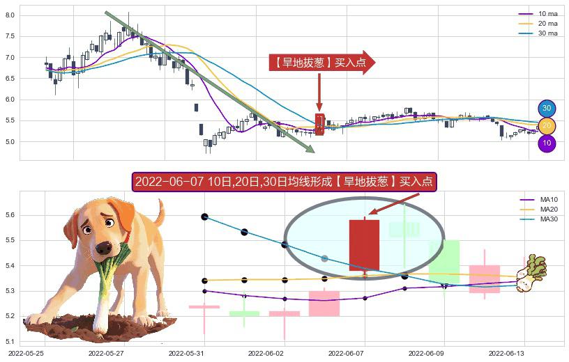 形态多维评估: ⚀ 2022-06-07日显现 10日-20日-30日均线 【旱地拔葱】买入点 看多信号,后市看涨,买入