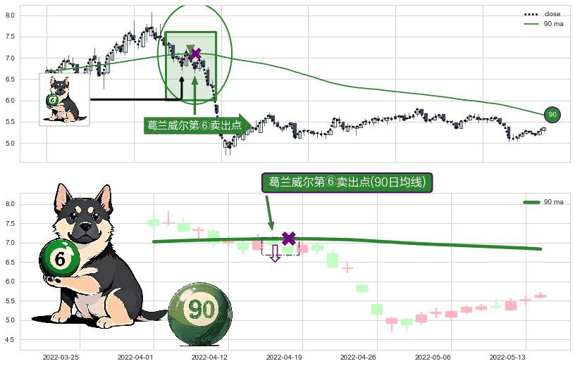 形态多维评估: ⚀ 2022-04-15-日显现 葛兰威尔均线 90日均线 第⑥卖出点 走势反转见顶信号,后市看跌,卖出信号