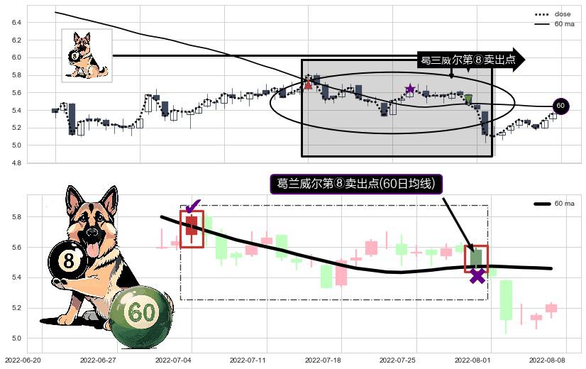 形态多维评估: ⚀ 2022-07-29-日显现 葛兰威尔均线 60日均线 第⑧卖出点 下降趋势的中继信号,后市看跌,卖出信号