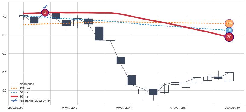 下跌趋势2022-04-12-2022-05-12,均线30确认关键阻力1处