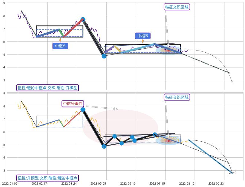 ➢ 【中枢A】:2022-01-28-2022-03-31,中枢由4笔构成,共40交易日, ZG=6.93, ZD=6.37