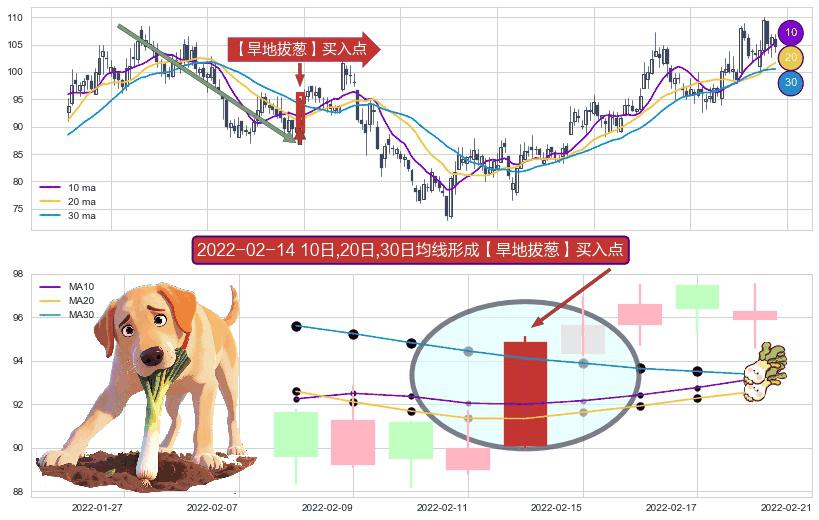 形态多维评估: ⚀ 2022-02-14日显现 10日-20日-30日均线 【旱地拔葱】买入点 看多信号,后市看涨,买入