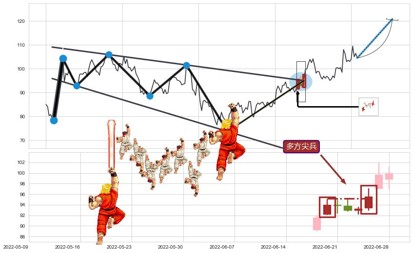 | 2 🅚:下探上涨 ➕ 📐:降旗形向上突破击穿阻力位, 猜想持续拉升上涨,被突破的阻力位已变为支撑位 ☞ 看多信号 ⇥ 【🅚线】交织【图形】⇥ 综合量化分数: 56 | > |