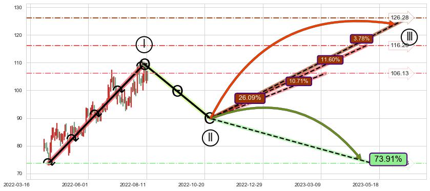 ➢ 高概率大级别循环上涨浪被破坏,反转向下(突破5浪起点)概率73.91%
