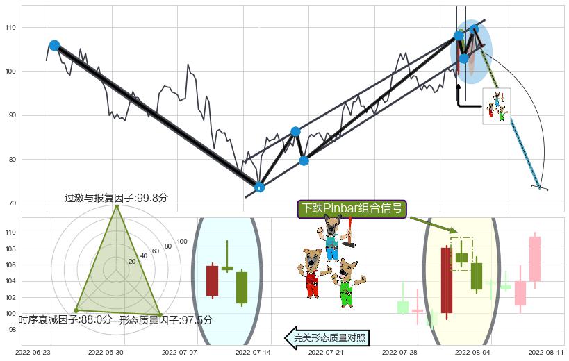 ♘ 支撑价格位87.98,可信任强度92.34%,距离最后交易2022-08-12形成的收盘价格104.50相差 -15.81%