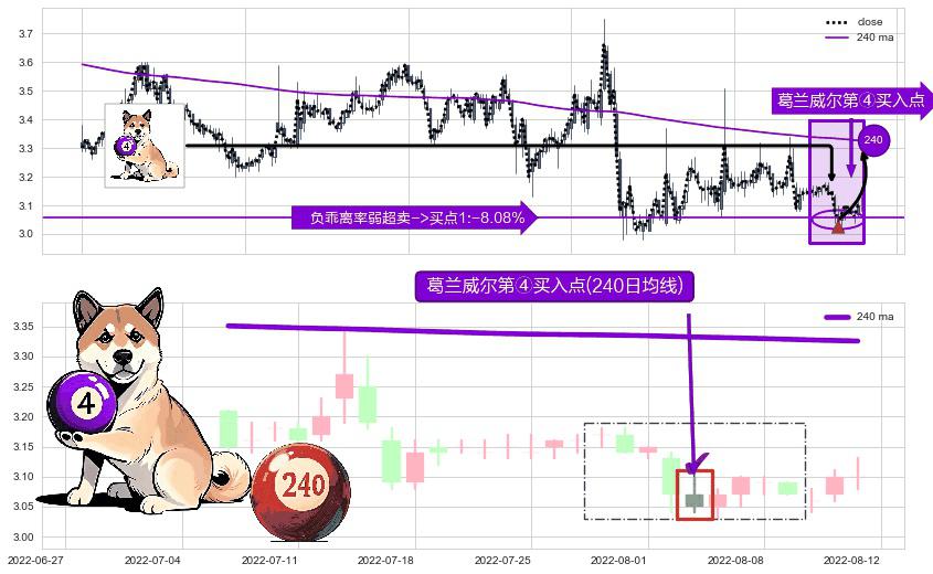 形态多维评估: ⚀ 2022-08-03-日显现 葛兰威尔均线 240日均线 第④买入点 下降趋势均值回复的短线反弹信号,后市看涨,买进信号