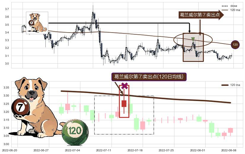 形态多维评估: ⚀ 2022-07-13-日显现 葛兰威尔均线 120日均线 第⑦卖出点 下降趋势的中继信号,后市看跌,卖出信号