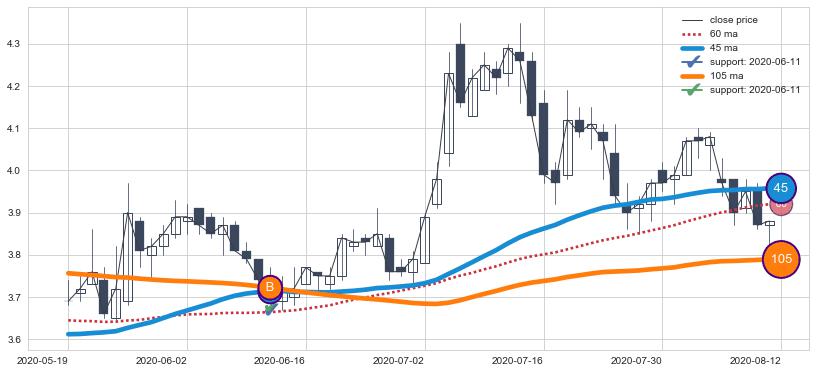 上涨趋势2020-05-19-2020-08-12,均线105, 45确认关键支撑1处