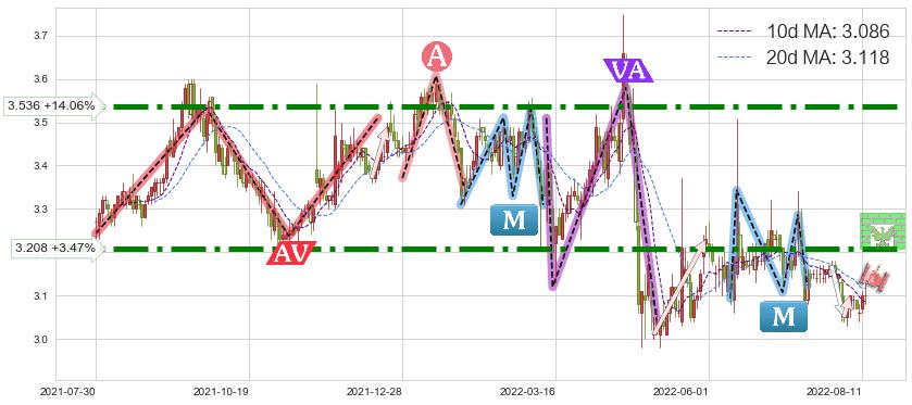 ♘ 阻力价格位3.208,可信任强度88.65%,距离最后交易2022-08-12形成的收盘价格3.100相差 +3.47%