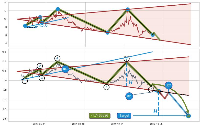 ➢ 最小反转跌幅→𝐇: 6.44 (逐步抬高阻力斜边最后的阻力点⑥与支撑边垂直距离)