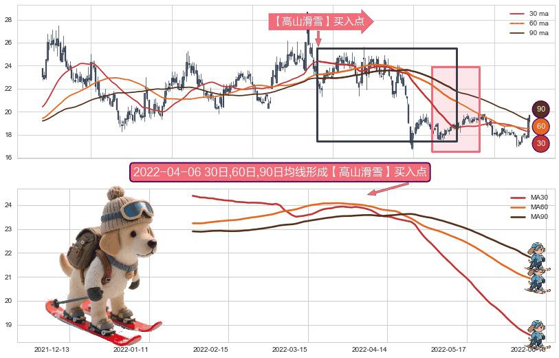 形态多维评估: ⚀ 2022-01-26日-2022-06-09日显现 30日-60日-90日均线 【高山滑雪】买入点 看多信号,后市看涨,买入