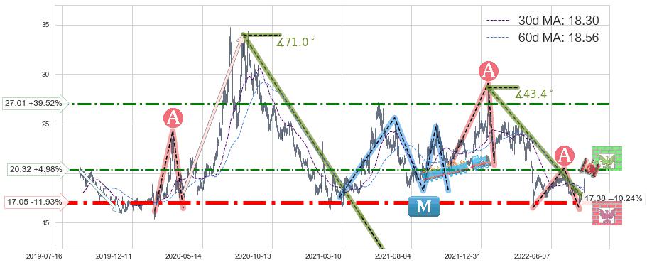 ♘ 支撑价格位17.05,可信任强度99.05%,距离最后交易2022-08-12形成的收盘价格19.36相差 -11.93%