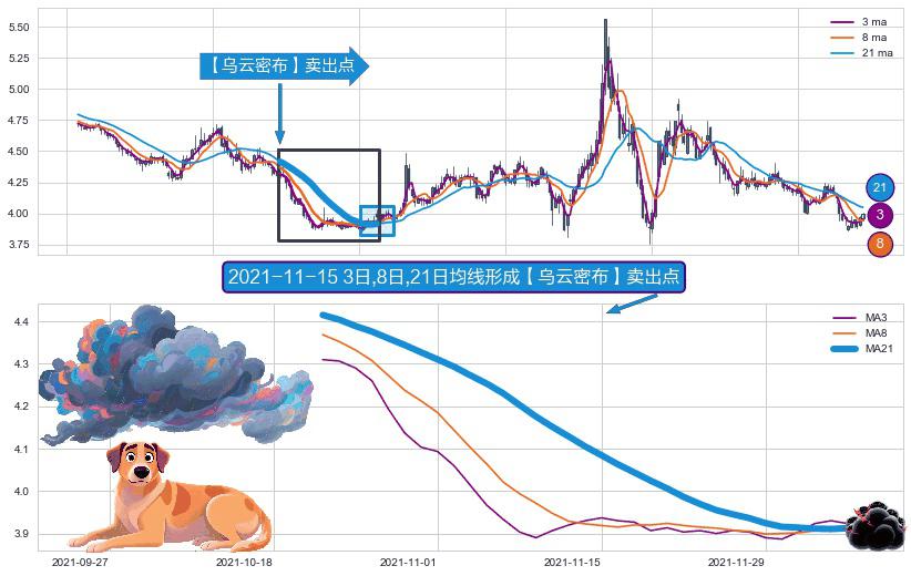 形态多维评估: ⚀ 2021-10-21日-2021-12-07日显现 3日-8日-21日均线 【乌云密布】卖出点 看空信号,后市看跌,卖出