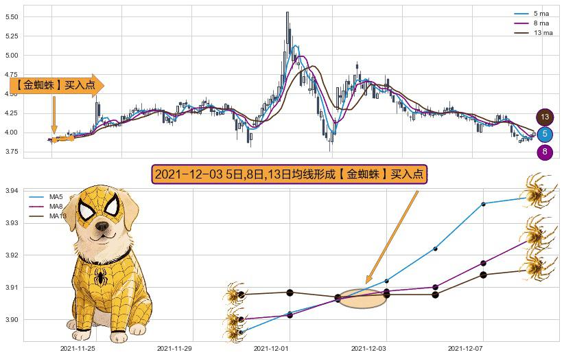 形态多维评估: ⚀ 2021-12-03日显现 5日-8日-13日均线 【金蜘蛛】买入点 看多信号,后市看涨,买入