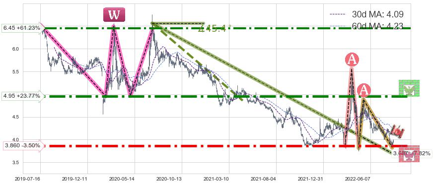 ♘ 阻力价格位4.95,可信任强度90.31%,距离最后交易2022-08-12形成的收盘价格4.00相差 +23.77%