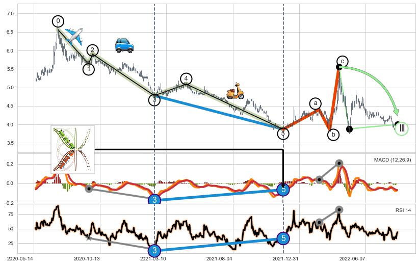 ➢ a,c调整浪MACD, RSI, KDJ走势都【未出现】背离,abc走势延续, 5浪反转概率增强