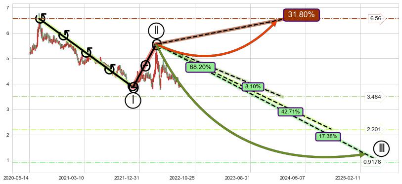 ➣ 调整浪已超过预测的c点位置,后续大趋势循环浪继续下跌概率68.20%,谨慎做多