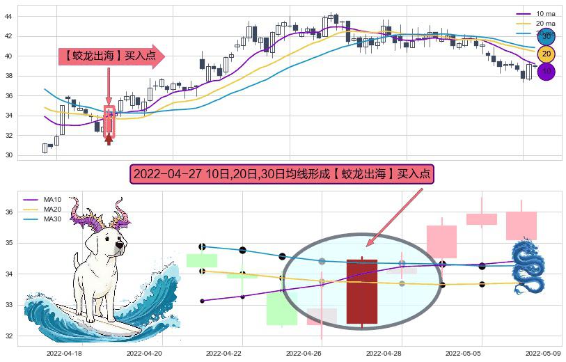 ⚄ 【蛟龙出海】买入点长时间对 熊 市转 牛 市进行确认,且均线烘托价格走势,但信号发出时间较长,属于【迟滞】看多买入信号