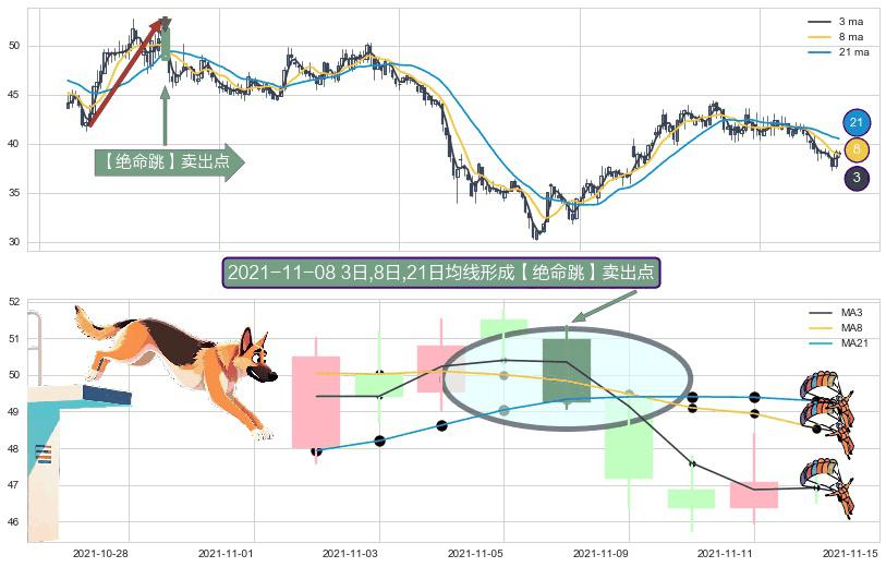 形态多维评估: ⚀ 2021-11-08日显现 3日-8日-21日均线 【绝命跳】卖出点 看空信号,后市看跌,卖出