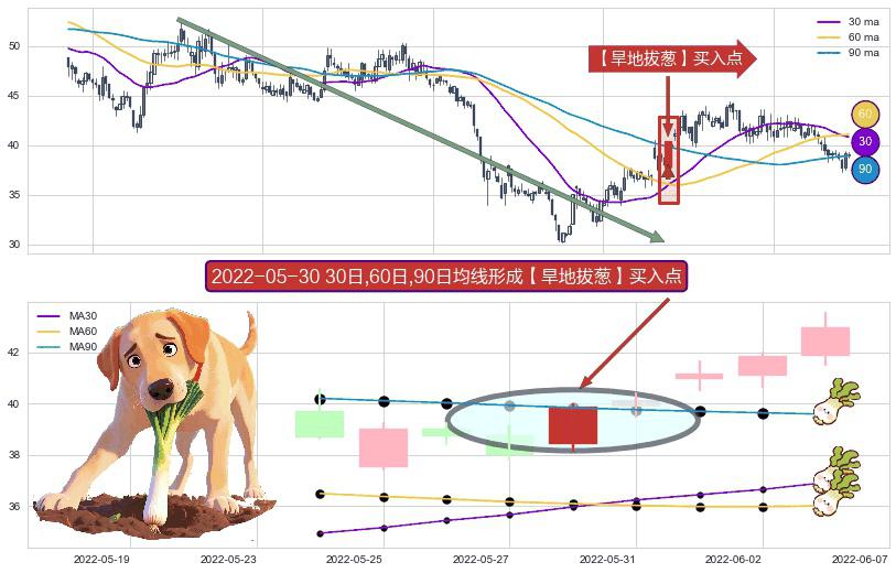 形态多维评估: ⚀ 2022-05-30日显现 30日-60日-90日均线 【旱地拔葱】买入点 看多信号,后市看涨,买入