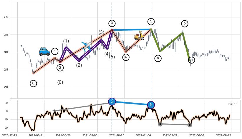 ➣ a,c调整浪MACD, RSI, KDJ走势都【未出现】背离,abc走势延续, 5浪反转概率增强