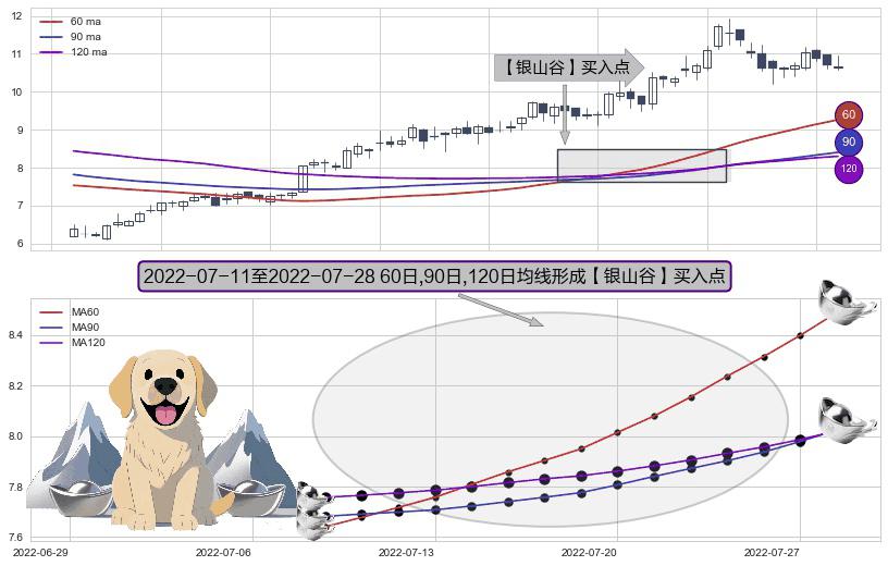 形态多维评估: ⚀ 2022-07-12-日至2022-07-28-日显现 60日-90日-120日均线 【银山谷】买入点 看多信号,后市看涨,买入