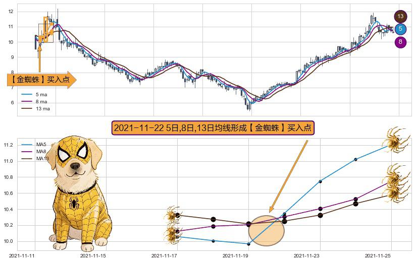 形态多维评估: ⚀ 2021-11-22日显现 5日-8日-13日均线 【金蜘蛛】买入点 看多信号,后市看涨,买入