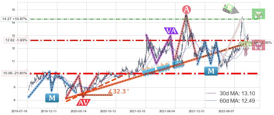♘ 支撑价格位12.62,可信任强度73.65%,距离最后交易2022-08-12形成的收盘价格12.87相差 -1.93%