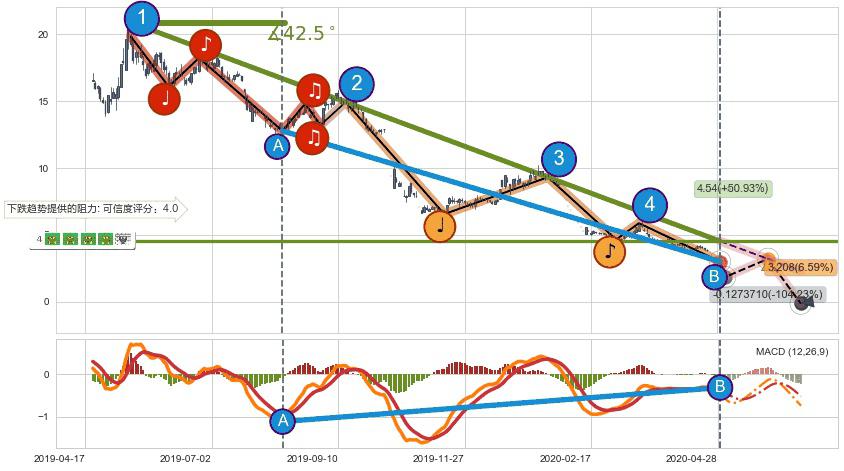 ♘ 在最后的下跌阶段2019-05-16至2020-04-29,存在 持续未破位的阻力位 ,阻力价格4.54,可信任强度86.20%,其距离最后价格3.010相差 +50.93%