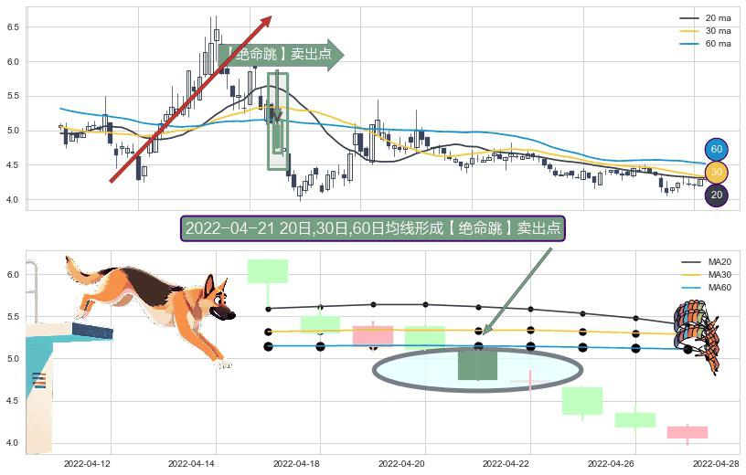 形态多维评估: ⚀ 2022-04-21日显现 20日-30日-60日均线 【绝命跳】卖出点 看空信号,后市看跌,卖出