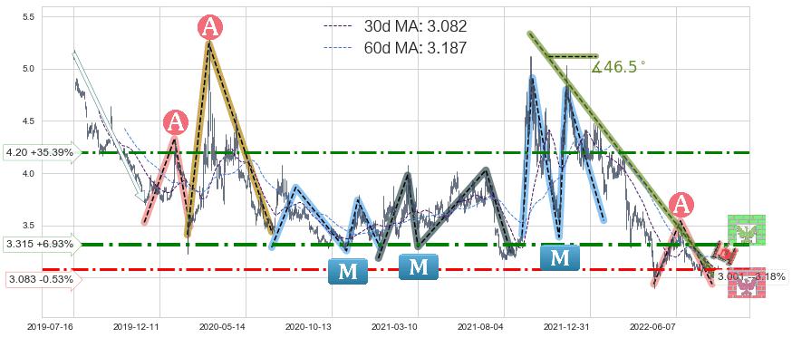 ♘ 阻力价格位3.315,可信任强度79.64%,距离最后交易2022-08-12形成的收盘价格3.100相差 +6.93%