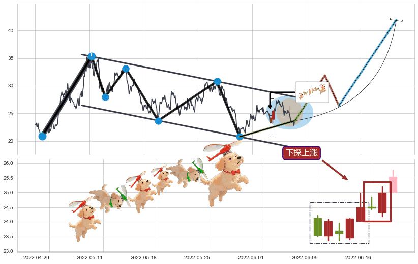 ➢ 低点影线(2022-03-28: 21.38 )→再次回踩→第一根k线高点(2022-03-16: 21.77 )
