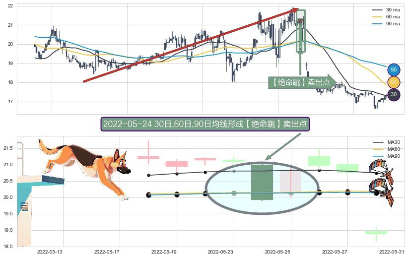 形态多维评估: ⚀ 2022-05-24日显现 30日-60日-90日均线 【绝命跳】卖出点 看空信号,后市看跌,卖出