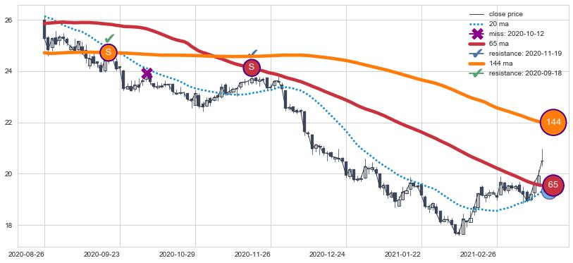 下跌趋势2020-08-26-2021-03-16,均线144, 65确认关键阻力2处