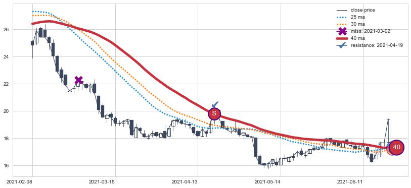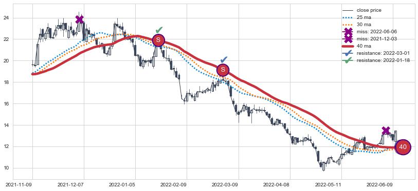 下跌趋势2021-11-09-2022-06-10,均线40确认关键阻力2处