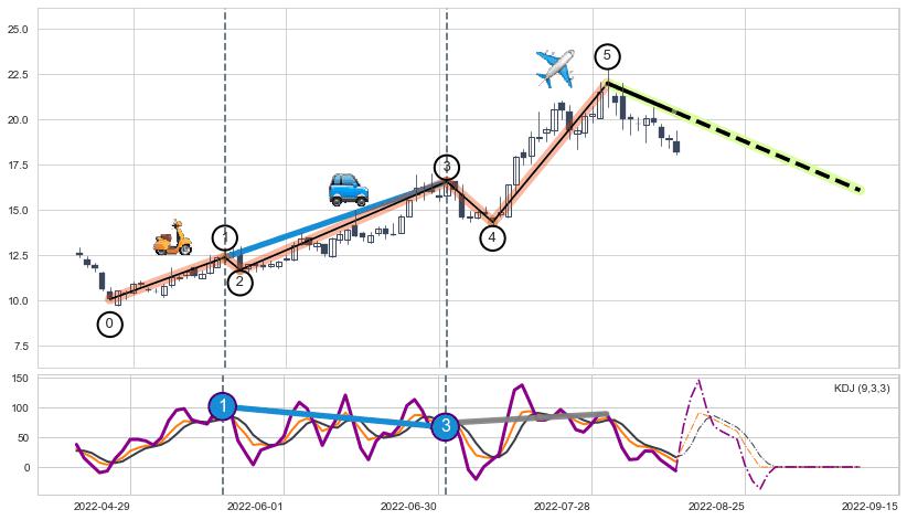 ➢ 第一, 三驱动浪端点:【KDJ】走势出现【常规背离 & 反转信号】背离程度46.10%,背离夹角角度57.0˚,背离程度中等
