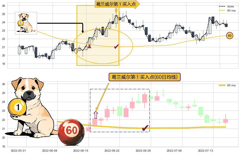 ⚀ 2022-06-16-日显现 葛兰威尔均线 60日均线 第买①入点 走势反转见底信号,后市看涨,买进信号