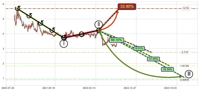 ♘ 在最后的下跌阶段2020-08-06至2022-08-11,存在 持续未破位的阻力位 ,阻力价格3.867,可信任强度87.31%,其距离最后价格3.320相差 +16.48%
