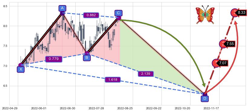 ➣ 未完成【蝴蝶】形态起点X: 2022-06-17, 已到达C点: 2022-08-03, 预测最终D点: 2022-09-13, 共62交易日