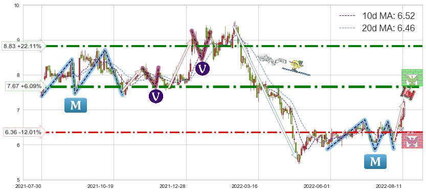 ♘ 阻力价格位7.67,可信任强度91.94%,距离最后交易2022-08-12形成的收盘价格7.23相差 +6.09%